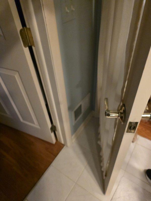 Conducted on-site assessment for potential HVAC ductwork modifications required for a bathroom remodeling project. Documented existing doorway transition between wood and tile flooring areas to evaluate airflow requirements and determine optimal placement of new ductwork to maintain proper ventilation in the renovated space.